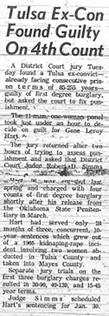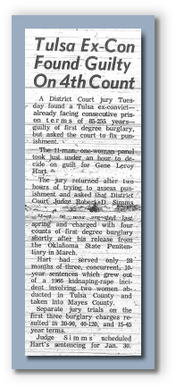 A few months after Gene Hart's release from prison on rape and kidnapping charges, Hart had a one week long career as a burglar.  It is difficult to follow these crimes because as the first three robberies occurred, they were not reported to the police and therefore not printed in the Tulsa World or Tribune.