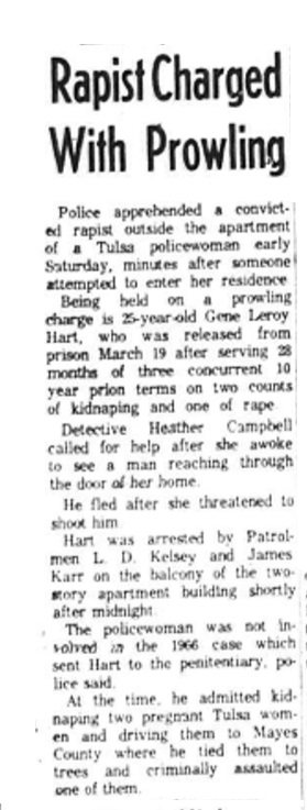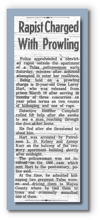 After searching the archives of the Tulsa World Newspaper for the days in question, it was really only when Gene Hart attempted a home robbery of a woman who was a Tulsa Police Officer and was arrested that his burglaries were made known in the newspaper.  The robbery of Officer Heather Campbell, TPD, did get at least a brief mention in the Tulsa paper.