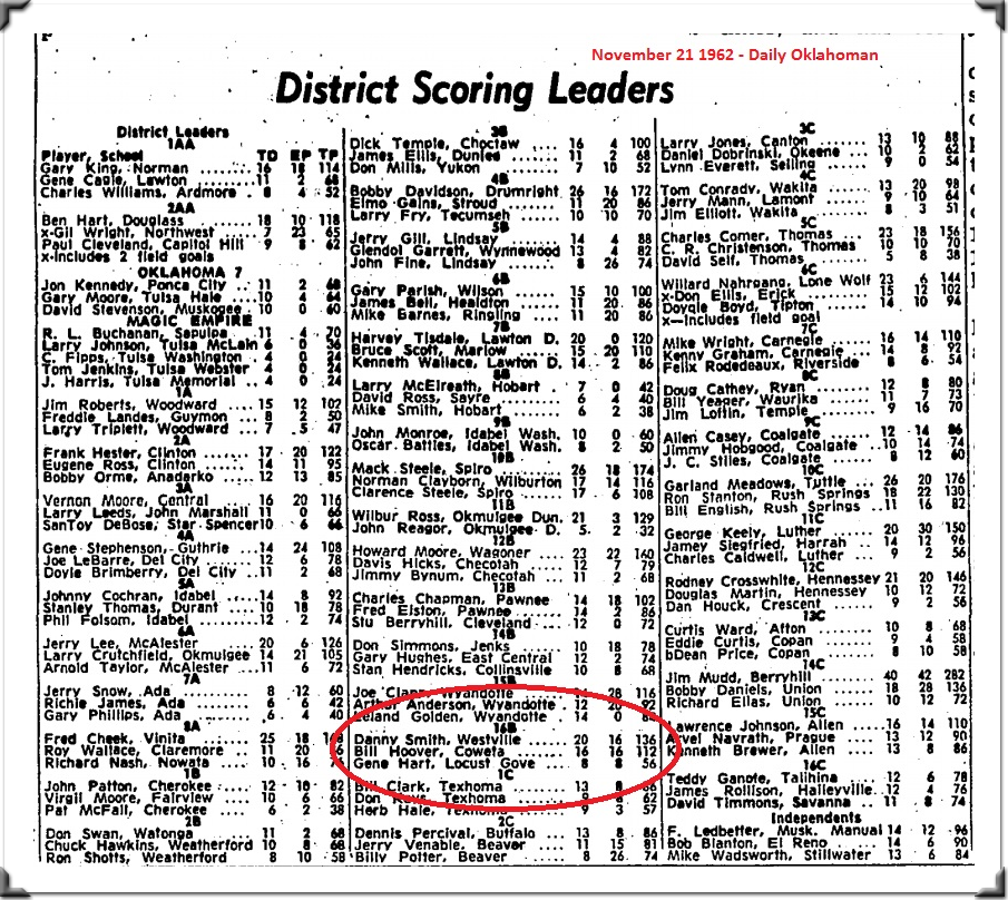 On November 21 1962 The Daily Oklahoman listed the top scorers in the state and Gene Hart was the 3rd highest scorer in class 16B. He had scored 56 points at that point.