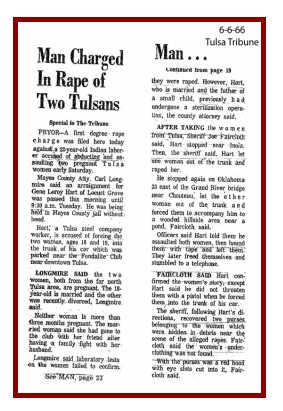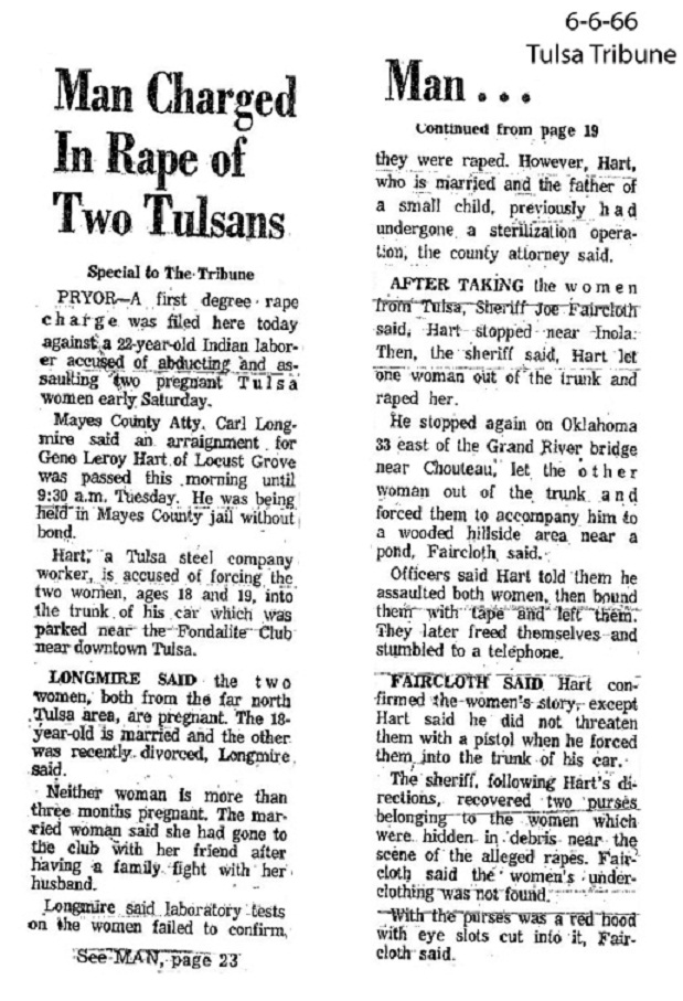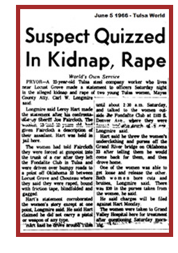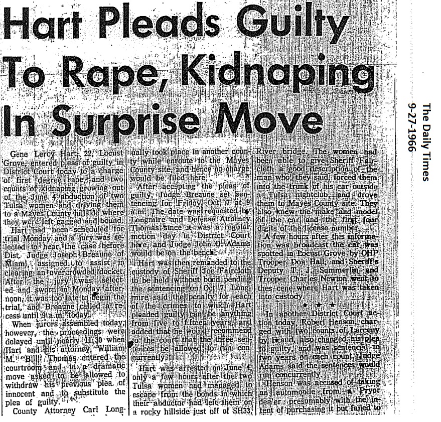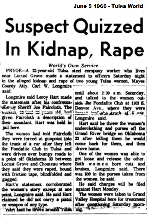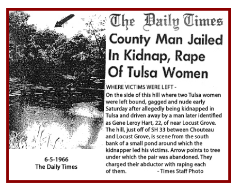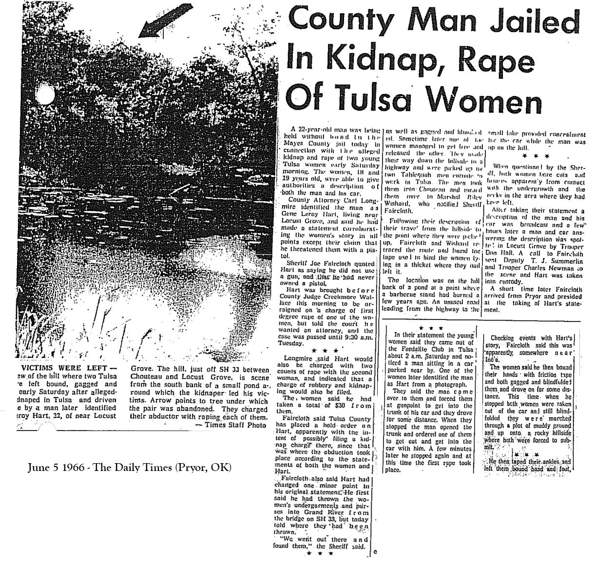 In June of 1966 Hart didn't go into work at his job in Tulsa at Flint Steel. Instead he abducted two, young, pregnant women from the parking lot of a Tulsa night club. He eventually drove them into Mayes County, then deep into the woods, where he brutally raped and sodomized his two victims.