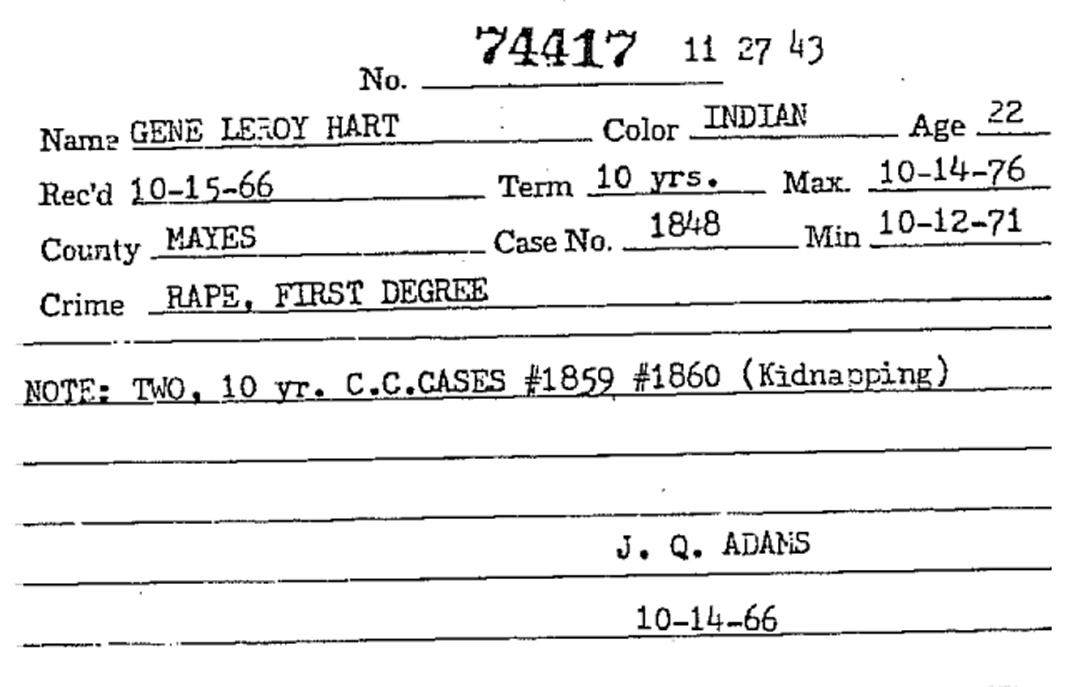 Gene Hart's arrest and prison vital statistics. Enters prison on 10-15-1966 for the kidnapping rapes of the two Tulsa women. He was given two 10 year sentences to be served concurrently.
