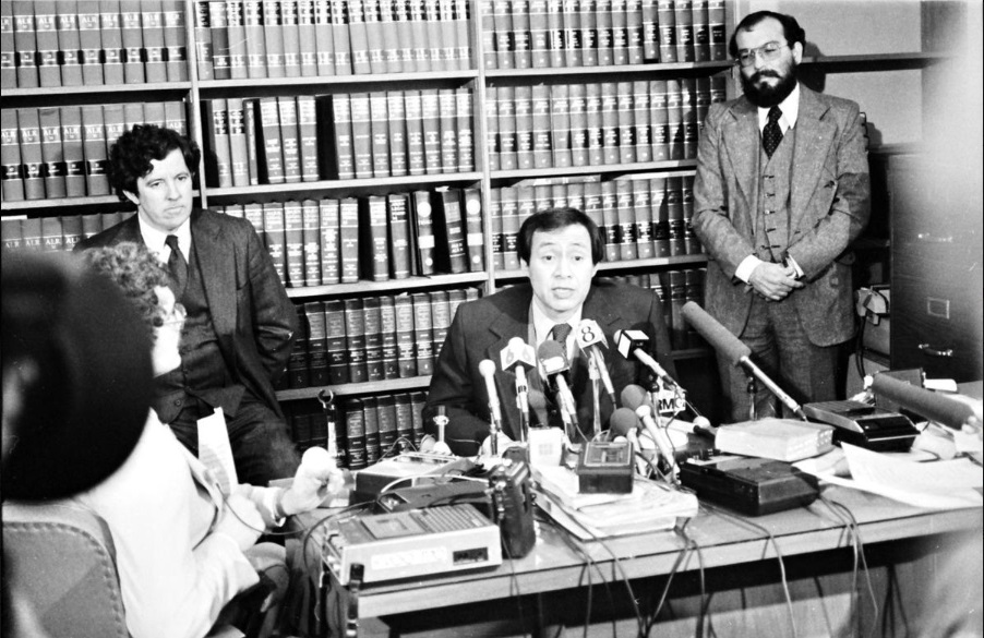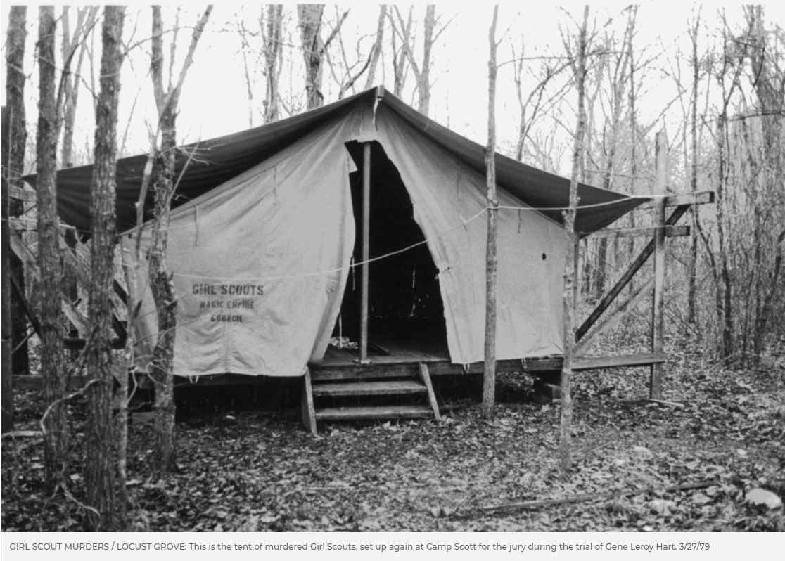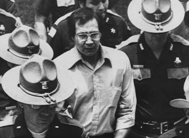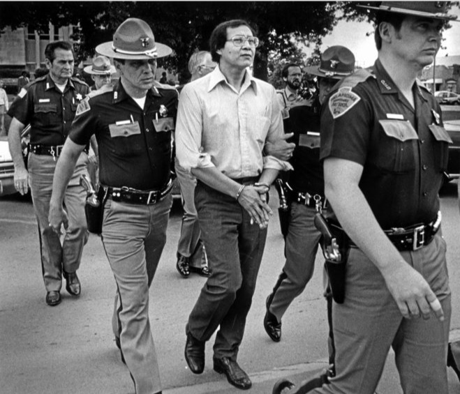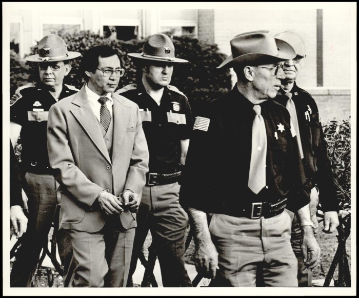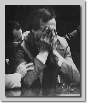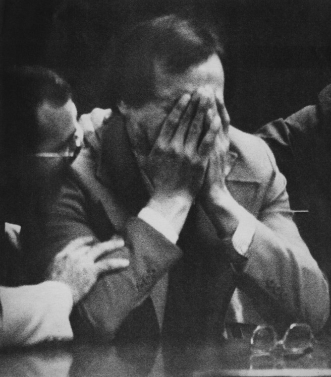 Gene Hart's reaction when hearing the verdict read three times, "Not guilty". The photo was taken through the window from the hallway outside the courtroom.
